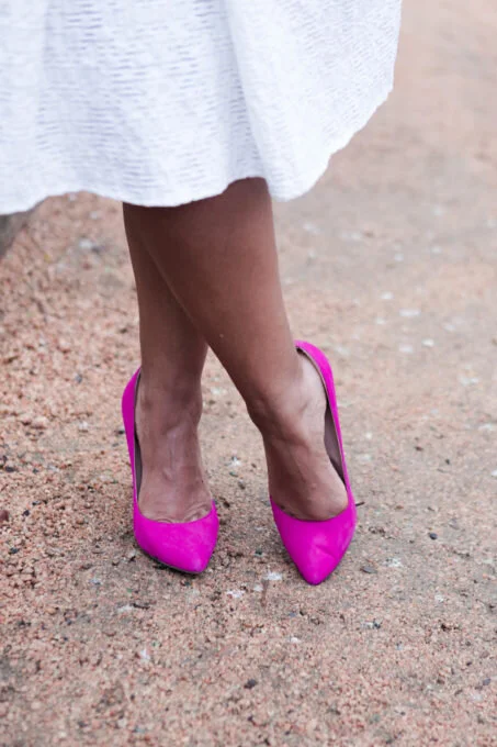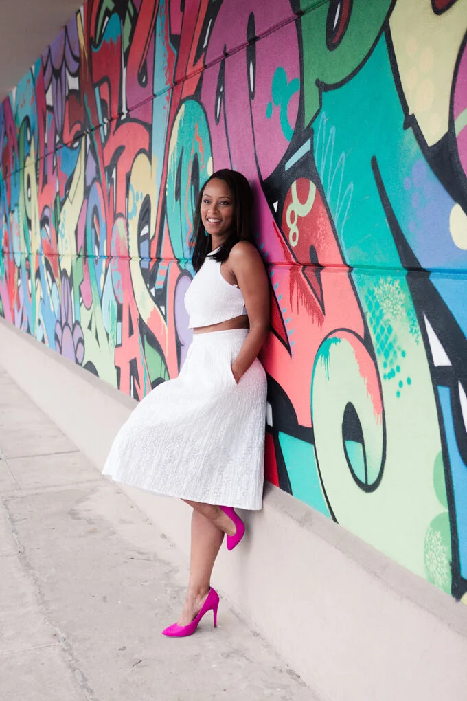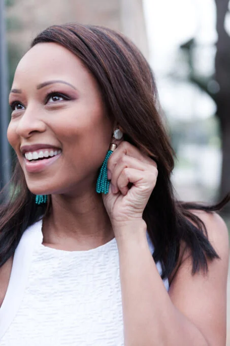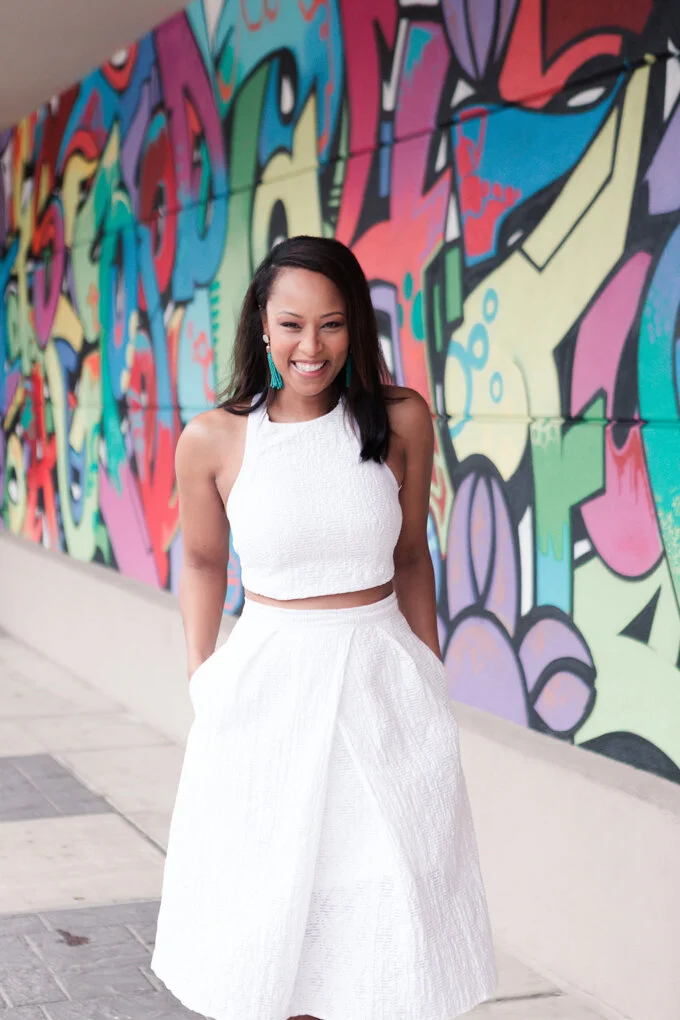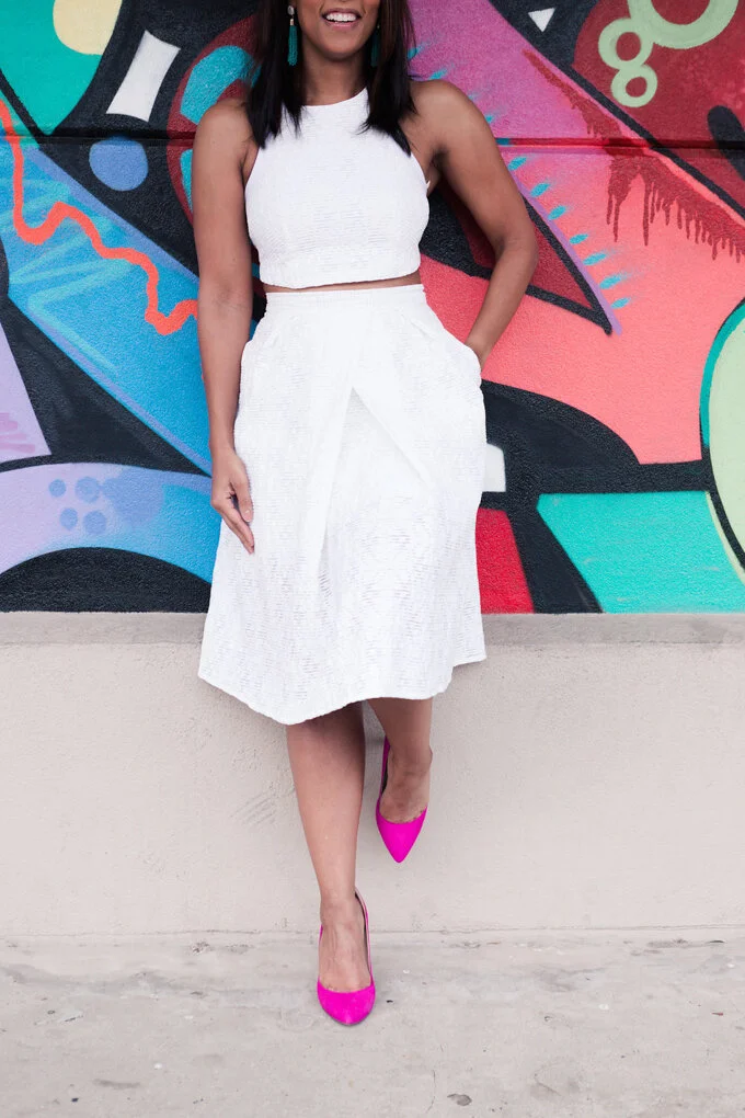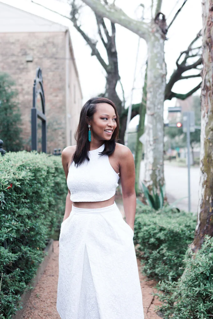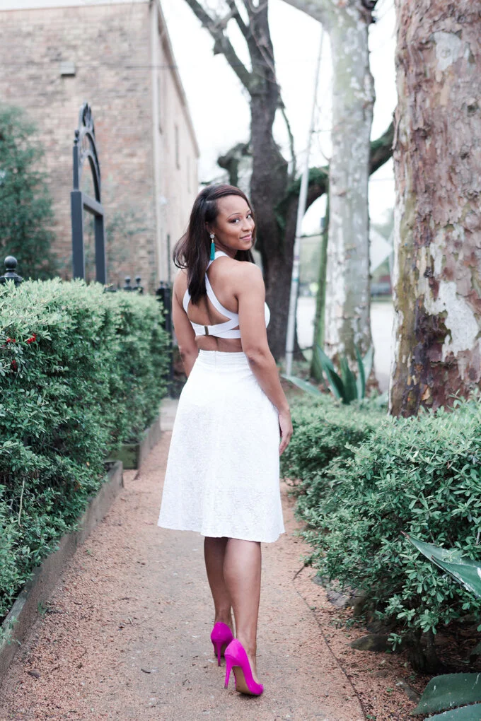 In the spirit of change and renewal, I thought that wearing white would be super appropriate. I used to be so afraid to wear white because of the old school rules I grew up with: 1. Don't wear white before Easter. 2. Don't wear white after Labor Day. 3. Just don't wear white because it gets dirty. And yada yada yada . . .But as I've grown older, I've learned that I truly LOVE wearing white. How could you not love the crisp cleanness of wearing white? Another thing I love is this outfit! It's a two-piece with a little peek-a-boo mid-drift area and a fun criss-cross back. The seersucker material is PERFECT for summer. Jazz it up with a little color pop in your earrings and shoes and we've got a winner here.